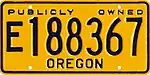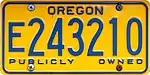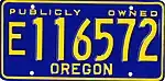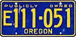 Government Exempt | Gold on blue; "PUBLICLY OWNED" at top and "OREGON" at bottom | E12-345 E123-456 E123456 |