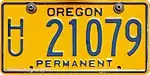 School Bus | Blue on gold; "SCHOOL BUS" at top, "OREGON" at bottom and "PERM" at right | S/C 12345 | S/C 00001 to present | ||