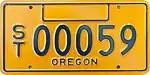Medium-Speed Vehicle | Blue on gold; "OREGON" at top | M/S 12345 | M/S 00001 to present | Issued to four-wheeled electrical vehicles that are equipped with a roll cage or a crushproof body design and have a maximum speed of 35 miles per hour. | |