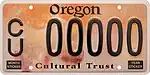Cultural Trust | 2006–2021 | Black on multicolored background. Embossed serials. Discontinued October 1, 2021. | C/U 12345 | C/U 00001 to present | Surcharge supports the Oregon Cultural Trust. |