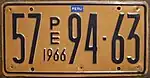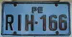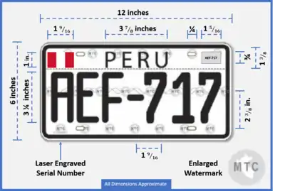 Peru requires its residents to register their motor vehicles and display vehicle registration plates.[1] Current plates are North American standard 6 × 12 inches (152 × 300 mm).