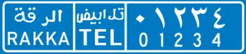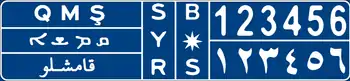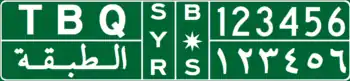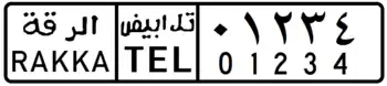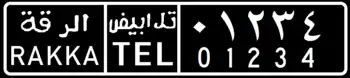 The Syrian license plates since 1997 have black lettering on a white background.[1] The plate is divided into 4 sections (when viewed from left to right):