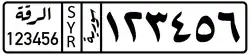 The license plates for the area under the control of this entity are issued based on governorates, similar to the practice in areas under the rule of the Damascus-based government. However, the configuration and style has changed significantly. The name of the governorate is written in Arabic, on the right hand side. The "SYR" national identity strip has been maintained in the middle, but a 3-letter governorate identity strip has been added.