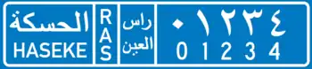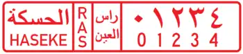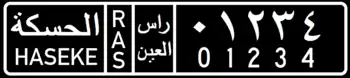 As for the Jazira Region, license plates are issued for each of the Districts under its jurisdiction, bearing in mind that Ras al-Ayn (Sere Kaniye) District is under Turkish occupation. Alongside Arabic names and 3-letter Kurdish codes, license plates of Jazira Region also generally show jurisdiction names in the Syriac Language of the ethnic Assyrian Minority of the region. For example, for the district of Qamishli, the 4-letter Syriac code "ܩ ܡ ܫ ܐ" is used, four disconnected letters that are meant to be an abbreviation of the Syriac name of Qamishli, "ܩܡܫܠܐ". For the district of Hasaka, the full name of the district in Syriac, "ܚܣܝܟܐ" is used.