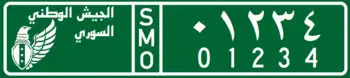 License plates installed on vehicles of "Syrian National Army" (SNA) also known as "TFSA" (Turkish-backed Free Syrian Army) have a green background and white text. These license plates do not display governorate and locality name, instead they show the name and logo of the "Syrian National Army" . These license plates display a 3-letter Turkish code "SMO", standing for the Turkish translation of the name of SNA Suriye Millî Ordusu.[6]