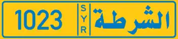 Police vehicle license plates do not show the governorate. They simply show the Arabic word "الشرطة" (Al-Shurta) meaning "Police". They have a yellow background and blue-coloured text. Their numbers consist of 4 digits.