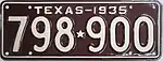 1935 | Embossed white serial with star separator on maroon plate with border line; "TEXAS–1935" centered at top | none | 123-456 | 1 to 999-999 | |
