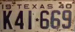 - ↑ "Old Texas License Plates". LeatherLicensePlates.com. Retrieved September 3, 2017.