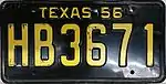 1956 | Embossed golden yellow serial on black plate; "TEXAS 56" centered at top | none | AB1234 | AA10 to approximately SV6000 | |
