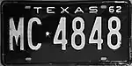 1962 | Embossed white serial with star separator on black plate; "TEXAS" centered at top; "62" at top right | none | AB-1234 | AA-10 to approximately VZ-4000 | |