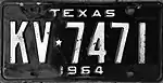 1964 | Embossed white serial with star separator on black plate; "TEXAS" and "1964" centered at top and bottom respectively | none | AB-1234 | AA-10 to approximately YT-1000 | |