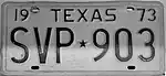 1973 | Embossed black serial with star separator on reflective white plate; "19 TEXAS 73" at top | none | ABC-123 | BBB-10 to approximately VDD-999 | |