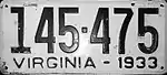 1933 | Embossed black serial on white plate; "VIRGINIA - 1933" at bottom | 123-456 | 1 to approximately 334-000 | |