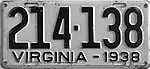 1938 | Embossed black serial on white plate; "VIRGINIA - 1938" at bottom | 123-456 | 1 to approximately 388-000 | |