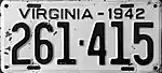 1942–43 | Embossed black serial on white plate; "VIRGINIA - 1942" at top | 123-456 | 1 to approximately 524-000 | Revalidated for 1943 with black tabs, due to metal conservation for World War II. |