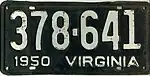 1950 | Embossed white serial on black plate; "1950 VIRGINIA" at bottom | 123-456 | 1 to approximately 783-000 | |