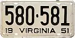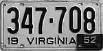 1951–52 | Embossed black serial on white plate; "19 VIRGINIA 51" at bottom | 123-456 | 1 to 999-999 | Revalidated for 1952 with black tabs, due to metal conservation for the Korean War.[6] Plates with serials A100-000 and up used narrower serial dies; this practice continued until 1969.[7] |