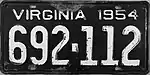 1954 | Embossed white serial on black plate; "VIRGINIA 1954" at top | 123-456 | 1 to approximately 999-999 | |