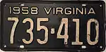 1958 | Embossed white serial on black plate; "1958 VIRGINIA" at top | 123-456 | 1 to 999-999 | |