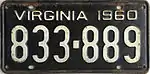 1960 | Embossed white serial on black plate; "VIRGINIA 1960" at top | 123-456 | 1 to 999-999 | |