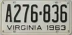 1963 | Embossed black serial on white plate; "VIRGINIA 1963" at bottom | 123-456 | 1 to 999-999 | |