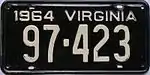 1964 | Embossed white serial on black plate; "1964 VIRGINIA" at top | 123-456 | 1 to 999-999 | |