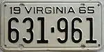 1965 | Embossed black serial on white plate; "19 VIRGINIA 65" at top | 123-456 | 1 to 999-999 | |