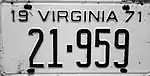 - ↑ Kretschmer, Rick. "Virginia Passenger Cars 1973-Present". Rick Kretschmer's License Plate Archives. Retrieved August 26, 2019.