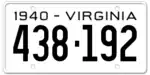 1940 | Embossed black serial on white plate; "1940 - VIRGINIA" at top | 123-456 | 1 to approximately 438-000 | |