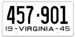 1945 | Embossed black serial on white plate; "19 - VIRGINIA - 45" at bottom | 123-456 | 1 to approximately 475-000 | |