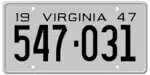 1947 | Embossed black serial on unpainted aluminum plate; "19 VIRGINIA 47" at top | 123-456 | 1 to approximately 567-000 | |