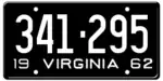 1962 | Embossed white serial on black plate; "19 VIRGINIA 62" at bottom | 123-456 | 1 to 999-999 | |