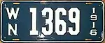 1915–16 | Embossed white serial on dark blue plate with border line; vertical "WN" and "1916" at left and right respectively | none | 12345 | 1 to approximately 45000, with gaps (see right) | Single series of all-numeric serials used for all classes of vehicles, including trucks, vehicles for hire and dealer vehicles.[4] |