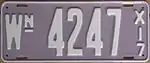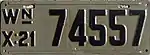 1916–17 | Embossed white serial on lavender plate with border line; "WN" at left and vertical "X17" at right | none | 12345 | 1 to approximately 64000, with gaps | The 'X' indicated the passenger class of vehicles; other letters were used for other classes.[4] |