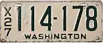 1927 | Embossed green serial on white plate; "WASHINGTON" at bottom, slightly offset to right; vertical "X27" at left | none | 123-456 | 1 to approximately 326-000 | |