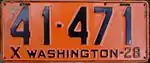 1928 | Embossed black serial on orange plate with border line; "X WASHINGTON-28" at bottom | none | 123-456 | 1 to approximately 343-000 | |