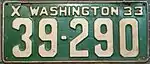 1933 | Embossed white serial on green plate with border line; "X WASHINGTON 33" at top | none | 123-456 | 1 to approximately 359-000 | |