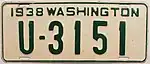 1938 | Embossed green serial on white plate with border line; "1938 WASHINGTON" at top | none | A-123-456 AB-1234 |