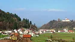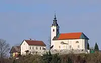 The local parish church, built on Kopanj Hill north of the settlement, is dedicated to the Assumption of Mary. It belongs to the Parish of Kopanj and the Roman Catholic Archdiocese of Ljubljana. It dates to the 15th century with 18th- and 19th-century additions.[13] The church is built on the site of an ancient fortification and was first mentioned in written sources in 1433.[5] During the Ottoman wars in Europe, the church was surrounded by a defensive wall. The poet France Prešeren spent three years of his childhood (1807–1810) living with his uncle Joseph in the rectory next to the church.[5] The Partisans burned the rectory on 17 December 1943.[9][10] The Partisans burned the church itself on 15 February 1944.[9][10] The parish priest and some locals were able to save the monstrance and ciborium from the burning church,[9] but the fire destroyed the 1769 painting The Assumption of Mary by Anton Cebej.[6][9]