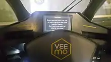The Veemo is a single person, pedal-electric (Pedelec) hybrid vehicle which is regulated as an electric bicycle to a top speed of 32 km/h (20 mph) and power limit of 500 watts in Canada.[10] The second generation vehicle weighs 62 kg and is capable of climbing hills of up to a 20% grade.[11] It is semi-enclosed and has sufficient storage space to hold a full-sized overhead baggage suitcase. The internal battery is replenished through battery swapping.[12]
