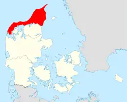 The North Jutlandic Island (Danish: Nørrejyske Ø), Vendsyssel-Thy, or Jutland north of the Limfjord (Jylland nord for Limfjorden) is the northernmost part of Denmark and of Jutland. It is more common to refer to the three traditional districts of Vendsyssel, Hanherred, and Thy. The area has been intermittently a tied island and, during modern times, was not surrounded by water until a storm in February 1825, which severed the region from the remainder of Jutland and caused a water connection between the North Sea and the western end of the Limfjord.[1] Hence, it is traditionally regarded as a part of Jutland rather than a separate island.