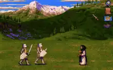 Vengeance of Excalibur has some important differences that set it apart from that of its predecessor. The first difference relates to individual combat, which now allows for 3-versus-3 fights, as opposed to the 1-vs.-1 battles of the original game. In addition, the player can no longer manually control his fighter: there are now however three different combat styles that the player can choose for every character who is fighting (reckless/full offense, normal, and cautious/full defense). The second difference is the size of the locations the player can travel to. In Spirit of Excalibur every location usually had a few scenes, like the outside and the inside of a castle, from which the characters could move to and from. In Vengeance locations often have more than two scenes, and the characters can be directed to more than one direction in each scene. This effectively creates a larger environment for the player to explore, and it makes in-game mazes and labyrinths possible.
