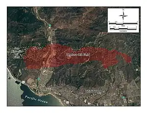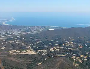 The oil field is on and beneath the ranges of hills northwest, north and northeast of the city of Ventura. The Ventura River, flowing down from Ojai, cuts through the field, and empties into the Pacific Ocean at Ventura. Native vegetation in the hills is predominantly chaparral and coastal sage scrub, and riparian woodland is found along the course of the Ventura River.[4] Terrain on the hills is steep, and the roads to well pads, tanks, and other infrastructure make numerous switchbacks. Most of the field is hidden from view from the city because of the first steep range of hills. The oil field is one of several following the east-west trend of the Transverse Ranges at this point: to the west are the San Miguelito Oil Field and the Rincon Oil Field, and to the east, across the Santa Clara River valley, the large South Mountain Oil Field adjacent to Santa Paula and the smaller Saticoy Oil Field along the Santa Clara River east of Saticoy. To the north are the smaller Ojai and Santa Paula fields. Total productive area of the field, projected to the surface, encompasses 3,410 acres (13.8 km2).[5]