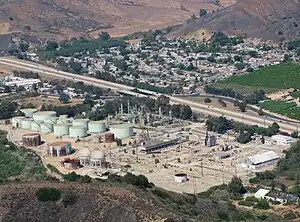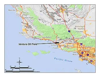 The Ventura Oil Field is a large and currently productive oil field in the hills immediately north of the city of Ventura in southern California in the United States. It is bisected by California State Route 33, the freeway connecting Ventura to Ojai, and is about eight miles (13 km) long by two across, with the long axis aligned east to west. Discovered in 1919, and with a cumulative production of just under a billion barrels of oil as of 2008, it is the tenth-largest producing oil field in California,[1] retaining approximately 50 million barrels in reserve, and had 423 wells still producing.[2] As of 2009 it was entirely operated by Aera Energy LLC.[3]