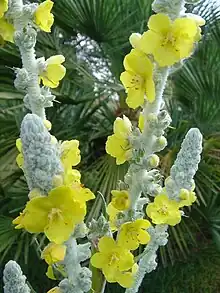 Verbascum bombyciferum, called the giant silver mullein, Turkish mullein and Broussa mullein, is a species of flowering plant in the genus Verbascum, native to Turkey, and introduced to California, Great Britain and Germany.[2] It is considered a good plant to attract pollinators.[3] With Verbascum chaixii it is a parent of the 'Pink Domino' cultivar, which has gained the Royal Horticultural Society's Award of Garden Merit.[4]