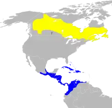 The Tennessee warbler breeds from the Adirondack Mountains in New York through northern Vermont, New Hampshire, and Maine north and west throughout much of Canada. It is also found breeding in northeast Minnesota and northern Upper Peninsula of Michigan. It is migratory, wintering in southern Central America, the Caribbean, and northern Colombia and Venezuela, with a few stragglers going as far south as Ecuador. It is a very rare vagrant to western Europe. This bird was named from a specimen collected in Tennessee, where it may appear during migration.