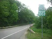 VT 108 passes through the area of the Mount Mansfield State Forest. It starts in Stowe and goes through Smugglers' Notch to Jeffersonville. The road cuts through Mount Mansfield. The road is very steep and winding, making it impossible to plow in the winter,[3] so the road is closed between the State Forest access parking lot and Smugglers' Notch Resort, usually from late October until May. Tractor-trailers are barred from this section of the route, though several trucks per year attempt traveling through and wind up getting stuck, incurring fines of over $2000.[4] Large straight trucks, buses and RVs are strongly encouraged to use alternate routes year-round. However, skiers come from alternate routes to cross-country, downhill ski, and snow mobile in the Smuggler's Notch Resort. Along the road, there are small parking areas where rock climbing and hiking are popular.