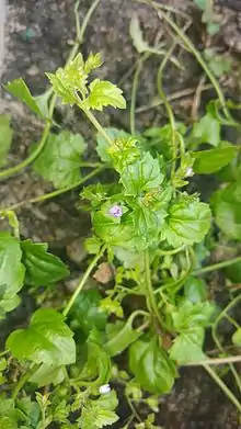 Veronica plebeia grows as a perennial herb, with stolons reaching 1 m (3 ft) in length.[4] Roots appear at nodes along the stolons.[5] The flowering stems can grow to 10 cm (4 in) tall. The leaves are roughly triangular or heart-shaped (cordate), measuring around 0.8–2 cm (0.3–0.6 in) long, and 0.5–1.6 cm (0.2–0.5 in) across.[4] The lilac to pale blue flowers appear from September to June, with peak times between October and January, as well as April.[5] They grow in clusters of 2 to 8.[6]