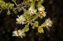 The flowers are faintly scented and arranged in small groups in leaf axils on stalks 0.5–1.0 mm (0.02–0.04 in) long. The floral cup is shaped like half a sphere, 1.0–1.6 mm (0.04–0.06 in) long, glabrous and smooth. The sepals are white to cream-coloured, 4–5 mm (0.16–0.20 in) long, with 2 or more hairy lobes. The petals are cream-coloured to white, broadly egg-shaped, 2–3.5 mm (0.08–0.1 in) long, joined for about 1 mm (0.04 in) of that length and have irregular teeth around their top edge. The style is 3.5–4.5 mm (0.1–0.2 in) long, straight with hairs just below its tip. Flowering time is mainly from July to November.[2][3][4]