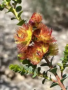 The flowers are scented and arranged in spike-like groups on erect stems 1.5–2 mm (0.06–0.08 in) long and the flowers open at about the same time as each other. The floral cup is top-shaped, about 3 mm (0.1 in) long, has 5 ribs and is glabrous and smooth. The sepals are deep red in colour, or deep red with yellow, 4–5.6 mm (0.16–0.22 in) long, with 10 to 12 feathery lobes. The petals are golden-yellow with red spots, egg-shaped, 5–7 mm (0.2–0.3 in) long, about 2.5 mm (0.1 in) wide with a fringe 1.5–2.5 mm (0.06–0.1 in) long and with deeply-divided, ear-shaped appendages. The style is about 6 mm (0.2 in) long, bent and has long hairs on its sides. Flowering time is from late October to December.[2]